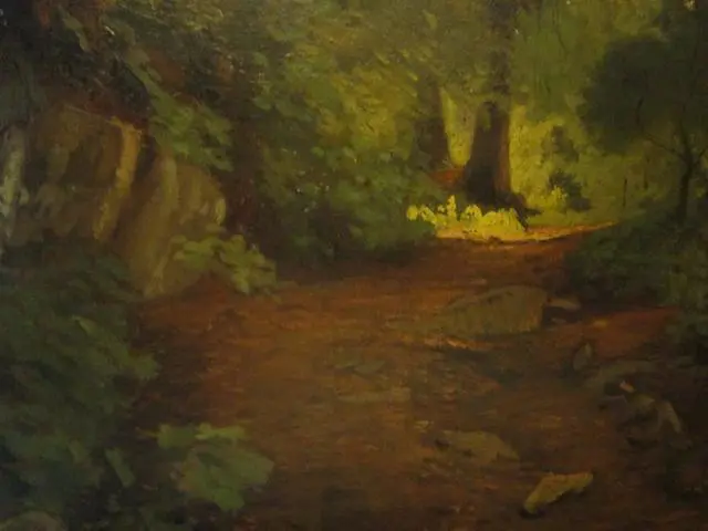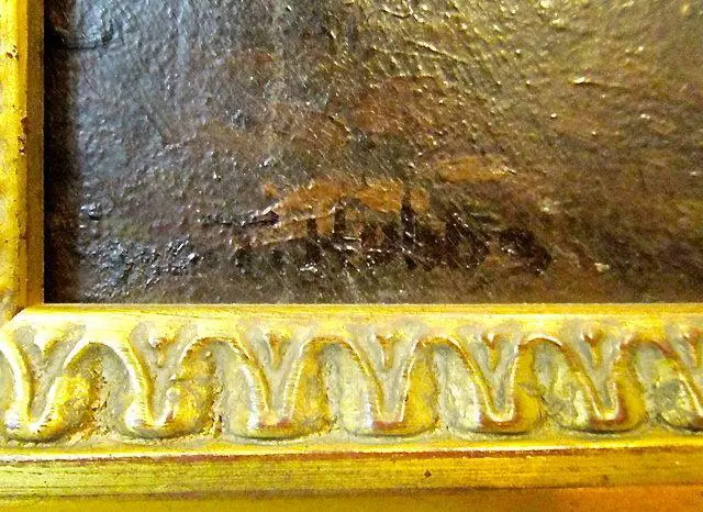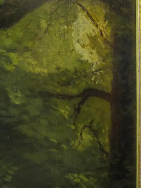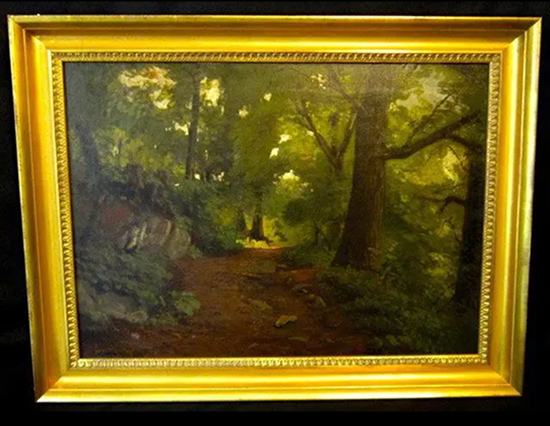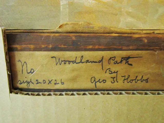 George Thompson Hobbs (American, 1846-1929) was a Philadelphia painter, born to architect Isaac H. Hobbs and Mary W. Hobbs. By 1866, George T. Hobbs had followed his father’s lead and become an architect and by 1891 the firm’s name was changed to Isaac H. Hobbs & Son to reflect his participation. However, the younger Hobbs always continued his interest in painting while working as an architect. During the 1870s, he studied painting at the Pennsylvania Academy of the Fine Arts and in 1883 studied with Bouguereau & Robert-Fleury at the Academie Julian in Paris. In 1887 he retired from the profession of architecture in favor of the profession of painter. He also was a picture restorer. This landscape depicting a path in the woods measures 20 x 26 inches, sight size, and 24 x 30 inches, framed. The painting is signed lower left and verso reads “Woodland Path By Geo T Hobbs size 20 x 26”. Because Hobbs was a Philadelphia artist, this painting could be a leafy section of Fairmount Park, maybe even more specifically the Wissahickon.